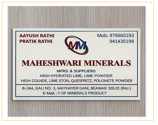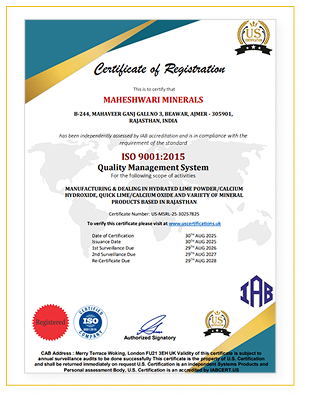 Maheshwari Minerals was founded in Rajasthan, India as a supplier and producer of top-of-the-line industrial minerals with an emphasis on purity and reliability. We have decades of experience in processing minerals such as Hydrated Lime Powder (Calcium Hydroxide), Quick Lime Powder (Calcium Oxide), Quick Lime Lumps, Quartz Powder and Limestone Powder, which allows us to deliver high-quality mineral solutions for different industries, using dependability as the guiding principle behind our products. Maheshwari Minerals is headquartered in Rajasthan, which is known to be a rich source of minerals. We focus on providing high-quality mineral products with high purity levels that are compliant with strict conditions set by industry standards.